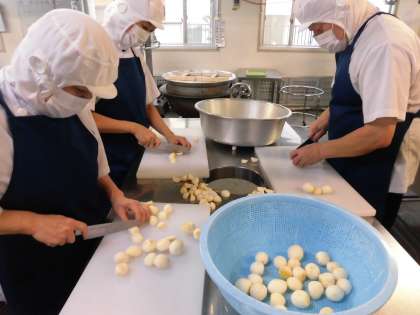さといもが煮物にはいっています。さといもは、皮をむくとぬるぬるしているので、切りにくいですが、この時期のさといもはとてもほくほくしていておいしいです。