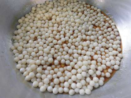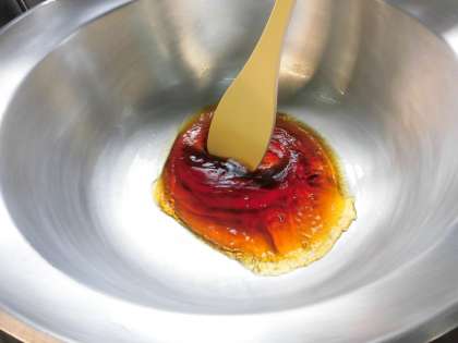 2枚目の写真は、みたらし団子のたれを、砂糖、こいくちしょうゆ、水を加熱し、でんぷんでとろみをつけて作っているところです。