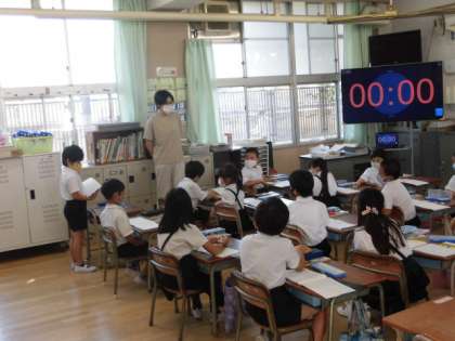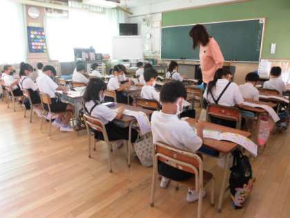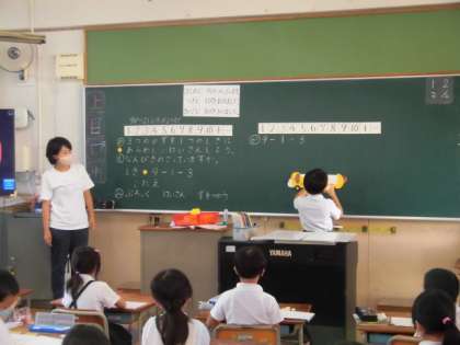 1組は算数で、9−1−3の3つの数の計算を考えています。しっかりと発表をする人の方を向いて、話を聞いています。2組は国語です。「山、目、下」」の漢字を丁寧に書いています。