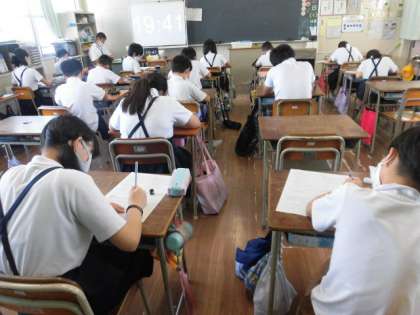 1組は英語です。2つの教室に分かれ、まわりの人とペアを組んで、その相手ができそうなことを15個の中から5つ選んで質問をします。2組は算数、「数の性質」についてのテストをしています。