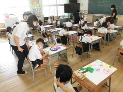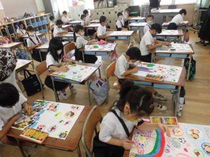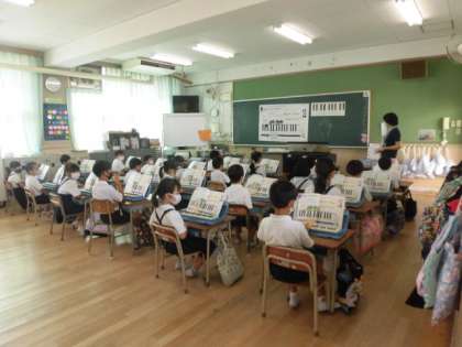 1組は図工です。「しゃぼんだまにのって」のしゃぼんだまの中に、自分や友だちなどがのった様子が随分とできてきました。2組は音楽です。「どれみであいさつ」を鍵盤ハーモニカの鍵盤で、「ドレミ」で歌って確認をしています。