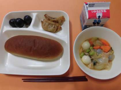 ・あげぎょうざ・中華煮・ぶどう(巨峰)・黒糖パン・牛乳 です。