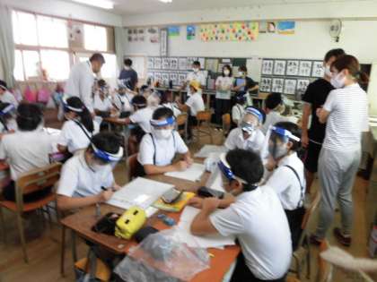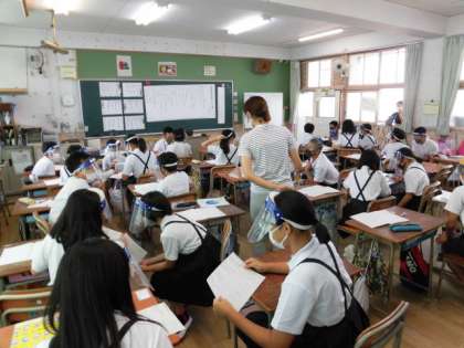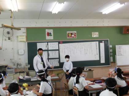 今日は教育実習生の授業です。「いま始まる新しいいま」という詩について、感じたことや考えたことなどを班で交流したり、ペアでお互い読みあったりしています。