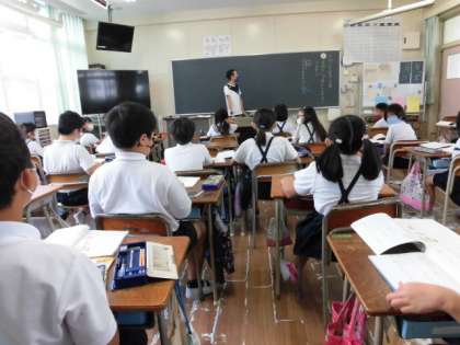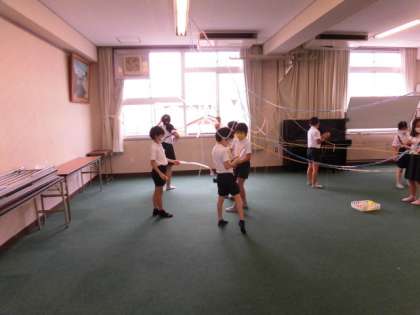 1組は音楽室にひもを張り、「ひもひもワールド」の世界をつくりあげています。楽しそうに活動をしていました。2組は国語で文法の学習をしています。