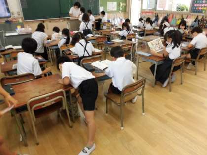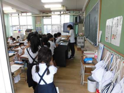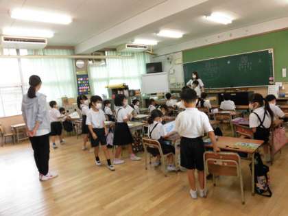 1組はノートの確認をしています。先生に見てもらうために、行列ができています。はなまるをもらうことができたかな?できた人は本を読んでいます。2組はカタカナ「ヌ、パ」の練習をした後、新しくなる教科書の確認をしています。新しい教科書でもいっぱい勉強しようね。
