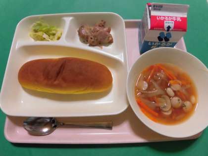 ・鶏肉の香草焼き・ウインナーとてぼ豆のスープ・キャベツのガーリックソテー・パンプキンパン・牛乳です。