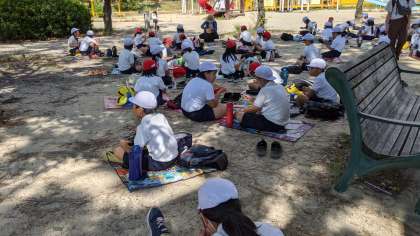 お弁当の時間になりました。おいしそうなお弁当がいっぱい。同じ方向を向いて食べるのは少し残念ですが…