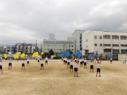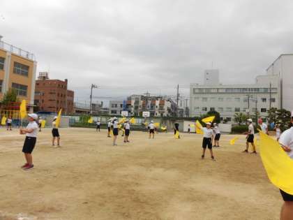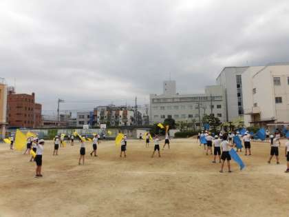 運動会の練習が始まっています。フラッグの練習をしています。これから動きを合わせてどんどんきれいになっていくのが楽しみです。