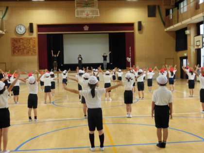 1年生と2年生の運動会の演技は2学年合同で行います。一つずつ動きを覚えていきます。みんな覚えるのがはやいです!