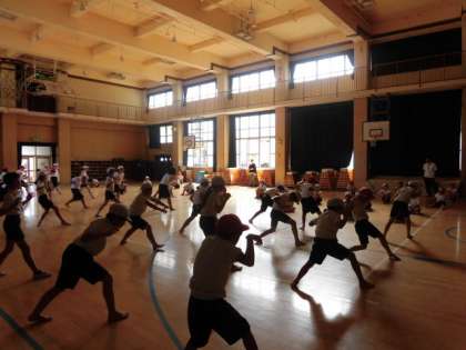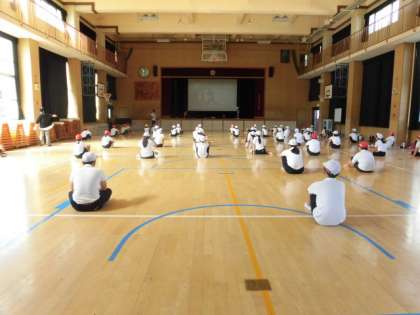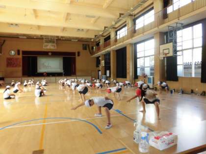 運動会の練習が始まっています。5年生はソーラン節です。実際にどのような意味のある動きかを、動画を見ながら確認していきます。低い姿勢がとれていますね!