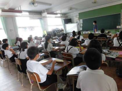 1組は社会です。昔の自然災害の様子を動画で見て、台風や地震などの災害について考えます。2組は英語です。いろいろな英語の単語が、どのようなアルファベットで表されるのかを考えています。