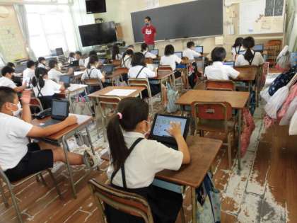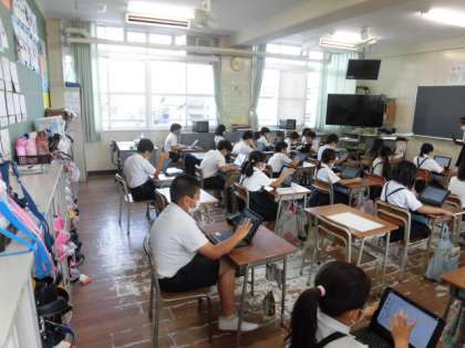 1組は算数で、1000万よりも大きな数について考えています。2組は学活の時間を利用して、タブレットドリルに取り組んでいます。みんな真剣に、黙々と問題を解いています。