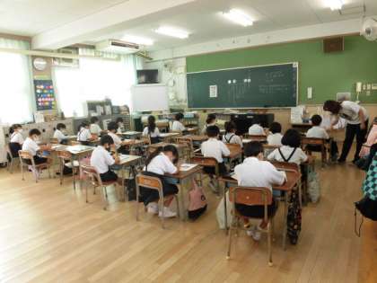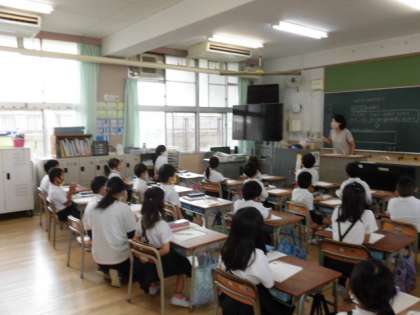 1組も2組も生活の時間です。1組は運動会のめあてを確認したり、金曜日に行った遠足についての振り返りをしたりしました。2組は先日、観察を行った「虫しらべ」について、観察表をつくっています。