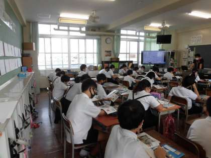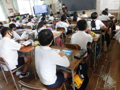 1組は社会です。長崎県など水産業の盛んな地域について、動画を見るなどして学習しています。2組は道徳です。「真由 班長になる」なるから、集団作りやリーダー、班員について考えます。班活動で大切なことなので、それぞれの立場の人のことを考える良い機会にしようね。