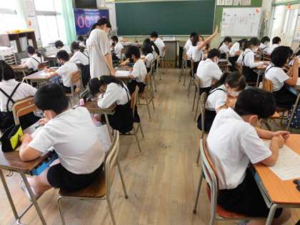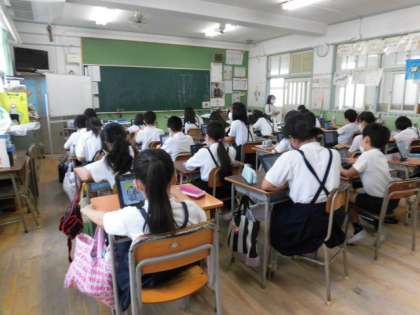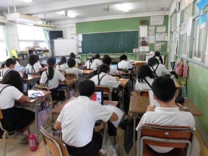 1組は、自分で考えた山場のある物語を考えた人から、タブレットのお絵描き機能を使って、絵を描いたり、本を読んだりしています。2組は国語のテストをしています。