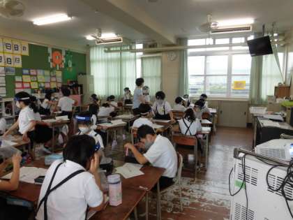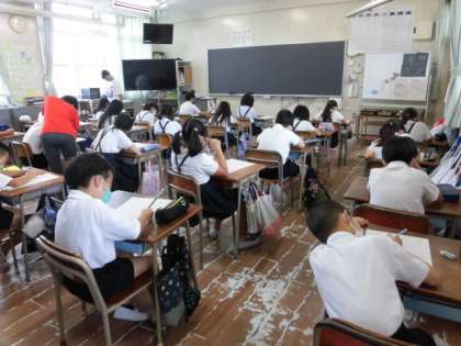 1組は国語です。「サーカスのライオン」を読んで感じた感想文を、グループでお互い話し合っています。2組は算数です。10000より大きい数の範囲のテストをしています。
