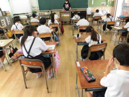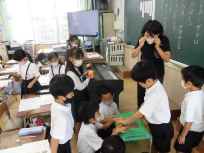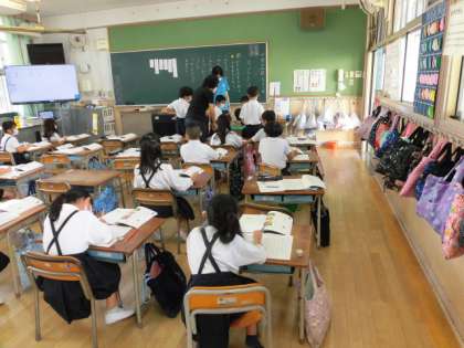 1組は生活です。「はっけんしたよ」で、先日行った長居公園への遠足で見つけたものや運動場でつかまえた虫や植物などについて、書いていきます。2組は漢字のテストをしています。1年生の漢字は生活に関わるものも多いので、しっかりと覚えていこうね。