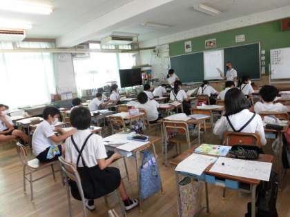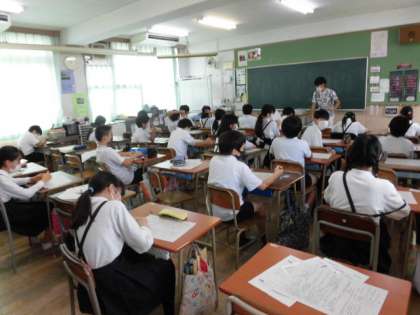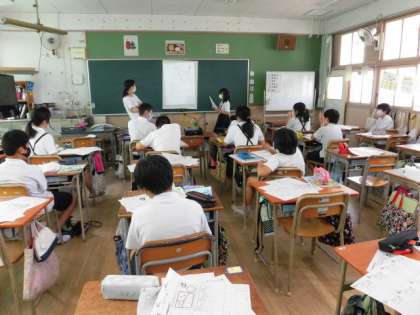 1組は国語のテストをしています。2組は家庭科です。自分で考えた給食のオリジナルメニューをみんなの前で、発表しています。
