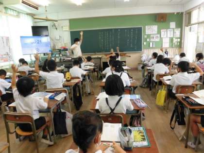 国語の授業です。できごとをつなぐ言葉「それから、ところが、こうして、すると」などに気をつけながら「絵を見てお話を書こう」について考えています。どんなお話ができるかな?