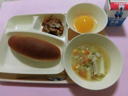 ・なすのミートグラタン・鶏肉と野菜のスープ・黄桃(缶)・黒糖パン・牛乳です。