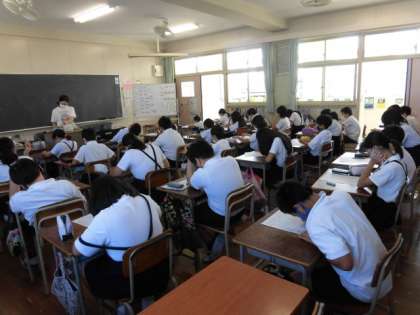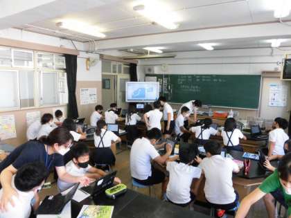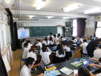1組は家庭科のテストをしています。環境についてや長期休み中にどのようなことができるかについて、考えて答えます。2組は理科です。今日は理科室にタブレットを持っていき、アメダスで日本全国の降水量について調べています。