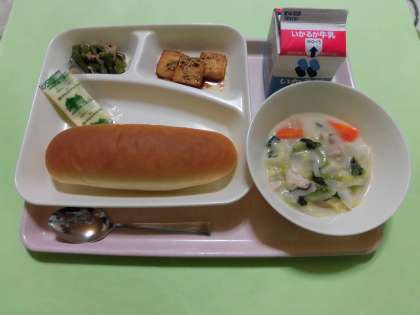 ・はくさいのクリーム煮・あつあげのごまじょうかけ・豚肉と三度豆のオイスターソースいため・ソフトマーガリン・コッペパン・牛乳 です。