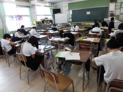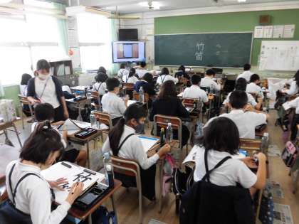1組は音楽です。教室と音楽室に分かれての授業です。音楽室では「風のメロディー」を歌っています。最初、恥ずかしいのか声が出ていませんでしたが、徐々に大きな声になりました。2組は書写で「竹笛」という字を書いています。