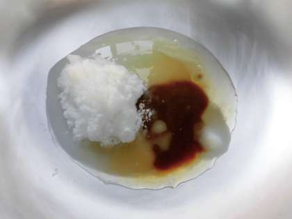 2、なべに砂糖、塩、こいくちしょうゆ、水を合わせて熱し、みつを作る。