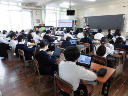 1組は社会のテスト前にタブレットで復習をしています。2組は明日の算数のテストに向けて、お互いに教え合っています。