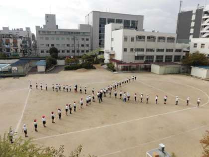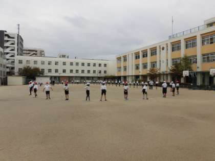 今日は運動場で運動会の練習です。エイサーの途中にどこに移動をするのかを確認をしています。