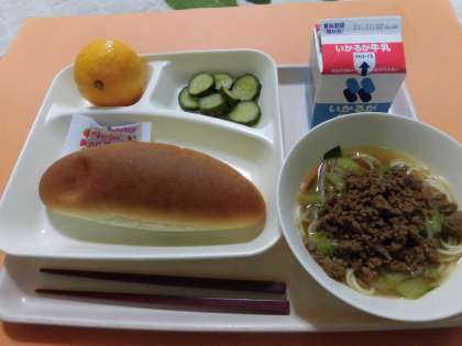 ・タンタンめん・きゅうりの甘酢づけ・みかん・コッペパン・いちごジャム・牛乳です。