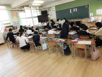 1組も2組も国語です。1組は自分が気にいった乗り物について、調べています。2組はちいさい「ゃ、ゅ、ょ」の練習をしています。ちいさい「ゃ、ゅ、ょ」もしっかりと覚えようね!