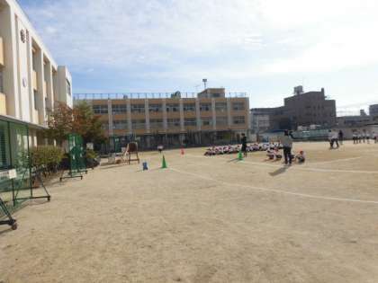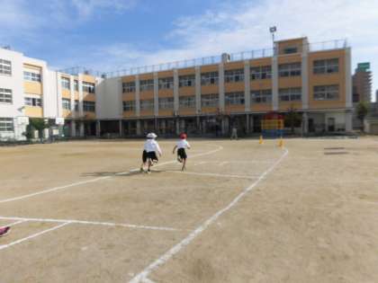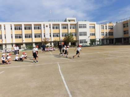 1,2年生の今日の1時間目は運動会練習です。徒競走の練習をしています。2年生の様子です。