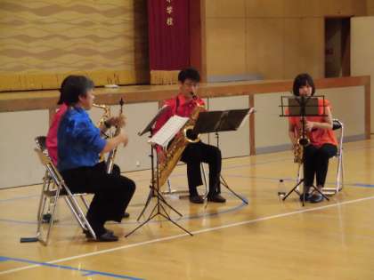 最後はアンコール曲「夜に駆ける」の演奏です。みんな目をキラキラと輝かせて、本物の音楽をじっくりと聴くことができました。エスパルク・サクソフォン・アンサンブルのみなさん、ありがとうございました!