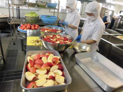 りんごは、実がなるとその周りの葉をとって日当たりを良くして育てます。すべて手作業なので、とても手間がかかっています。秋の実りと、育ててくださった農家の方、芯までとってくださった給食調理員さんにも感謝ですね。