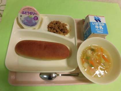 ・豚肉のデミグラスソース・スープ・ぶどうゼリー・黒糖パン・牛乳 です。