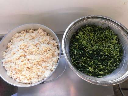 とり菜っ葉いためは、ささみとだいこん葉を使っています。ご飯に良く合いますね。