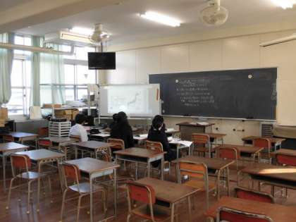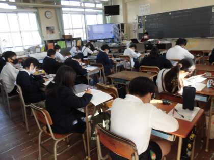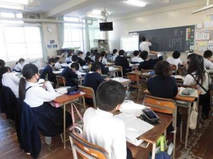 1組は算数です。2つのグループに分かれて、北海道と沖縄県、大阪府と東京都の人口密度について比較をしています。2組は社会です。自分たちのくらしにかかわる工業製品について考えています。