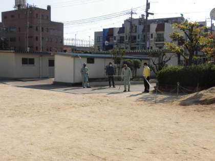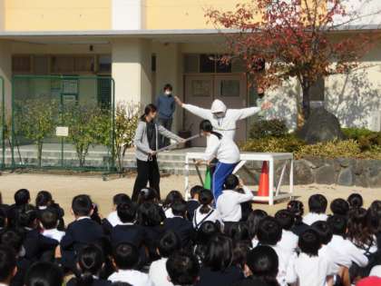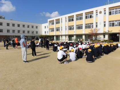 不審者が侵入したという想定で避難訓練を行いました。早速、管理作業員さんと事務職員さんが現場にかけつけてくれました。さすまたなどの防具の使い方などについて説明を聞いています。
