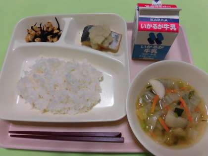 ・さごしのおろしじょうゆ煮・さといもの澄まし汁・大豆の煮もの・ご飯・牛乳です。
