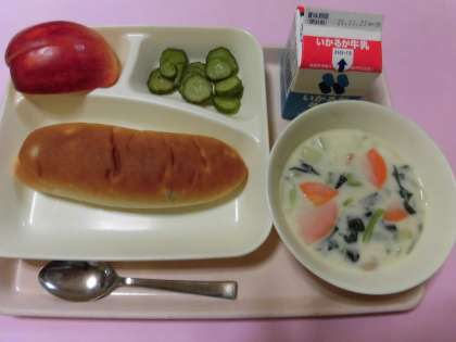 ・きのこのクリームシチュー・きゅうりのバジル風味サラダ・りんご・おさつパン・牛乳 です。