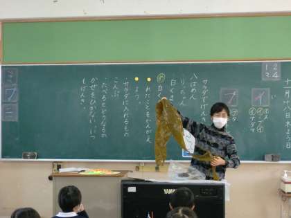 給食の澄まし汁のだしをとっただしこんぶを見てもらいました。こんぶは寒い海でもこんなに元気に大きくなるのですね。だからこんぶを食べると、風邪をひきにくくなるのね。