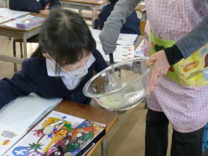 最後にアフリカゾウが、油と塩と酢を入れてかきまぜて、サラダにかけました。栄養教諭が実際にドレッシングを作った様子を見て、子どもたちは、「わぁ、おいしそう!」「すっぱいにおいがする!」とつぶやいていました。