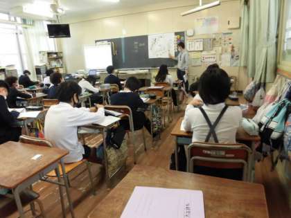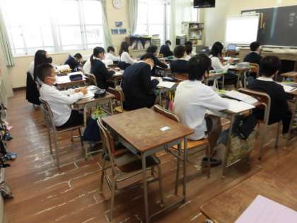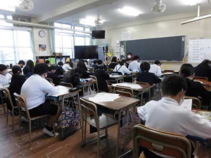 1組も2組も社会です。1組はテストに向けてプリントで復習をしています。2組は日本の工業地域や工業地帯について、まとめています。