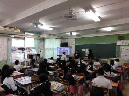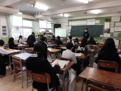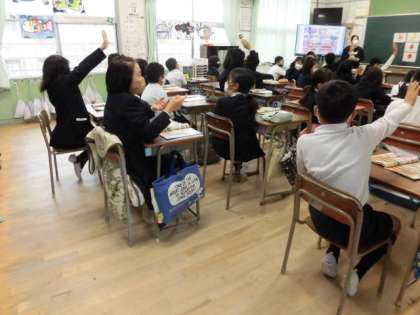 1組は社会のテストがかえってきました。地域の防災計画がどうつくられるかや学校に置かれている備品名について、復習をしています。2組は英語です。自分の好きなものについて、それをどう説明するかを考えています。