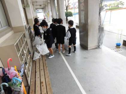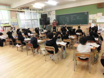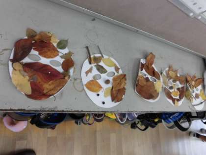 1組も2組も生活です。1組は「いえの人がしていること」と「じぶんでしていること」から「じぶんでできること」について考えています。2組は先週に行った「あきみつけ」で拾ってきた葉っぱやどんぐりなどでお面をつくりました。いろいろな表情のお面ができあがりました!余った葉っぱなどは、をきちんと片付けています。