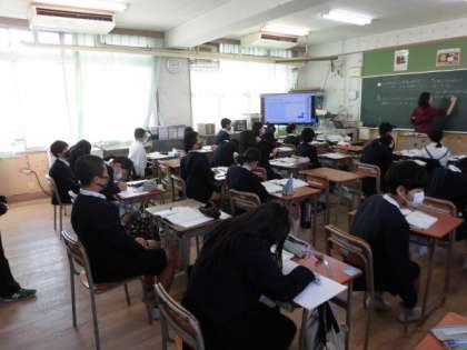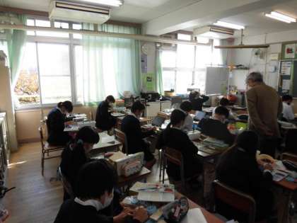 1組は図工です。テープカッターを作っています。カラフルな絵を描いています。2組は算数です。比例や反比例について考えています。