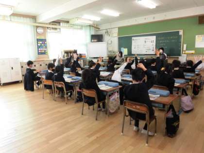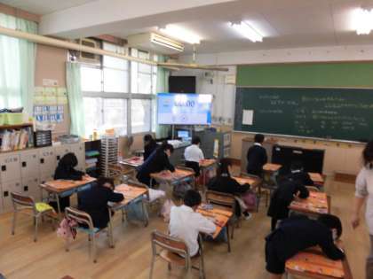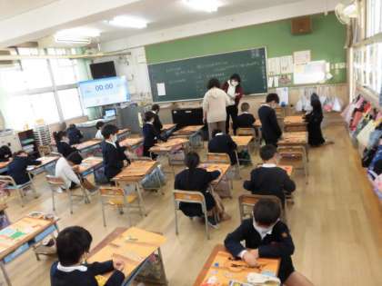 1組はお話の絵「おむすびころりん」の続きを描いています。おいしそうなおむすびを持っているねずみや、元気に運動をしているねずみがいっぱいです。2組は音楽です。「ぶんぶんぶん」など元気な歌声がろうかまで聞こえていました!