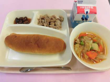 ・豚肉のガーリックソテー・ケッチャップ煮・うずら豆のグラッセ・レーズンパン・牛乳です。