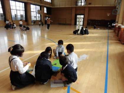 生活の授業です。今度、行われる「おもちゃランド」でどのように1年生を楽しませてあげるかについて、みんなで相談しています。1年生、楽しみにしていてね!